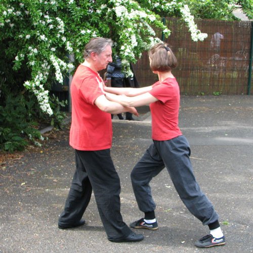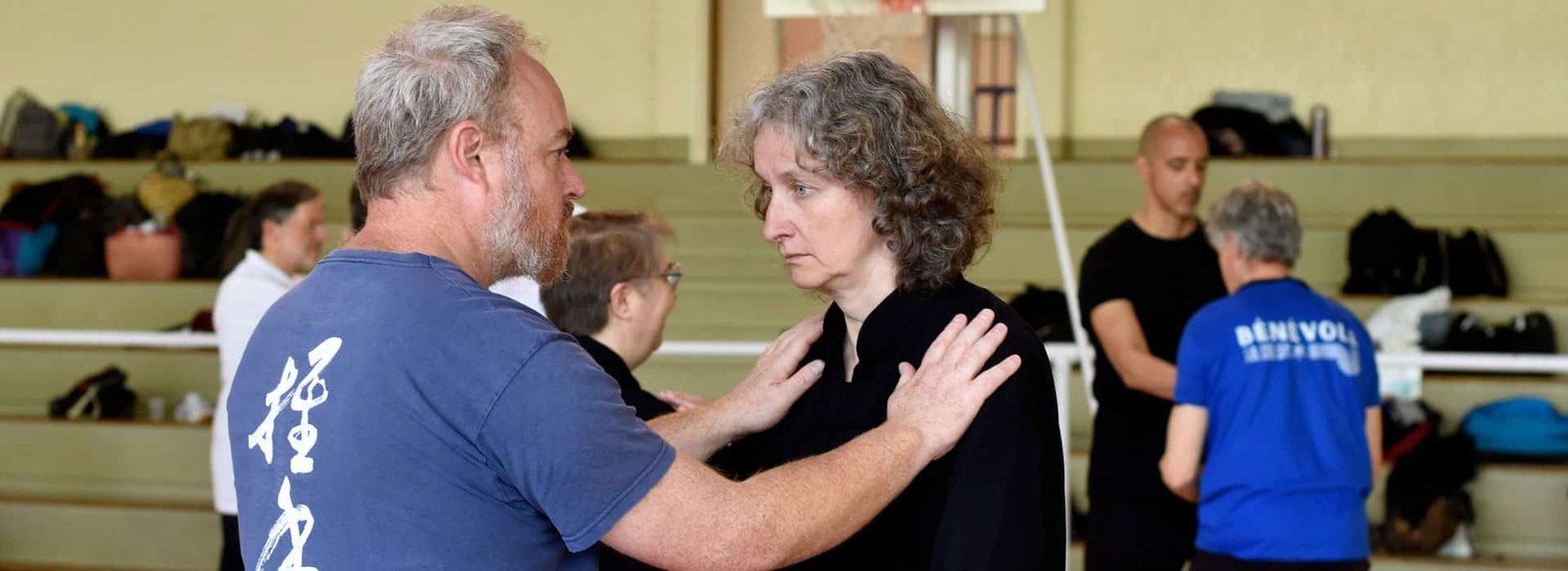 Les exercices avec partenaires permettent de travailler à deux ou plus pour explorer et découvrir les niveaux et interactions des poussées de mains ou mains collées.Les principes de base étant de céder, absorber et dévier. Les exercices avec partenaires développent la sensitivité. en développant relâchement et calme dans le mouvement, il est possible d'affiner cette sensitivité par l'intermédiaire des tissus nerveux, nous cultivons alors une qualité appelée proprioception.a tel point , qu'il est finalement possible 'de sentir' les intentions du partenaire avant que son action s’exécute en réalité.